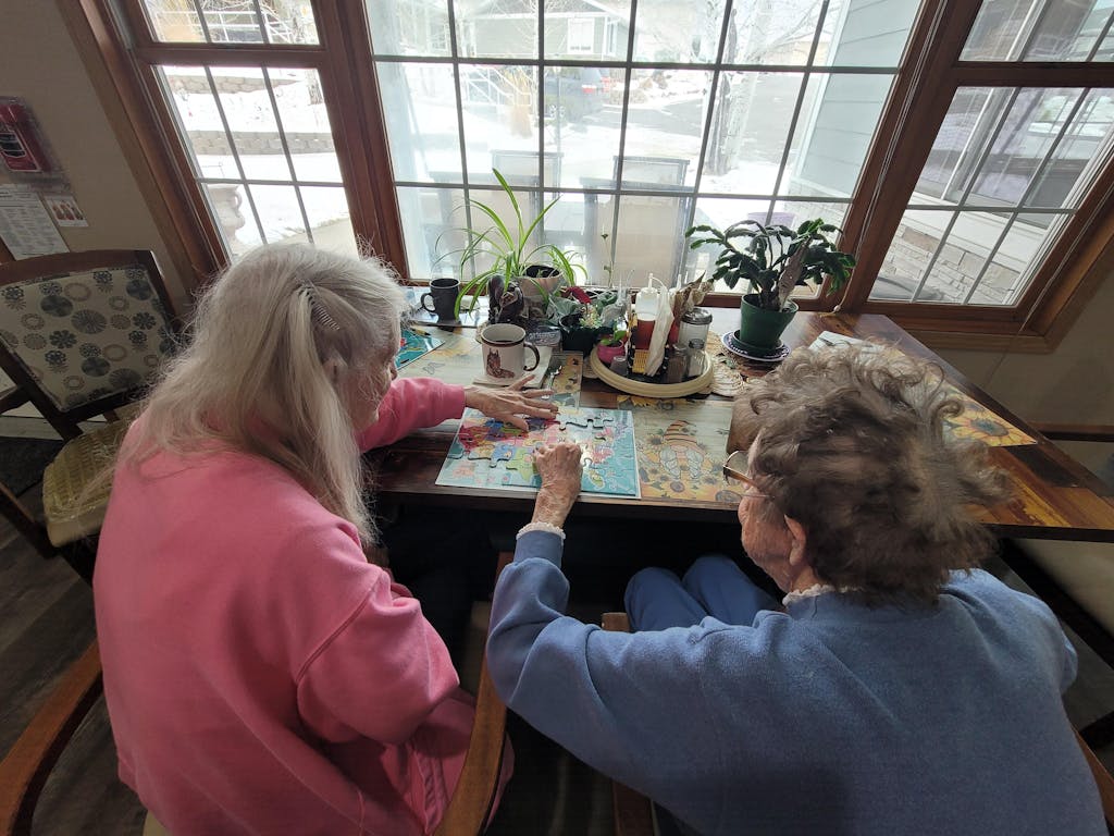 Elderly women doing cartoon states jigsaw puzzle smiling